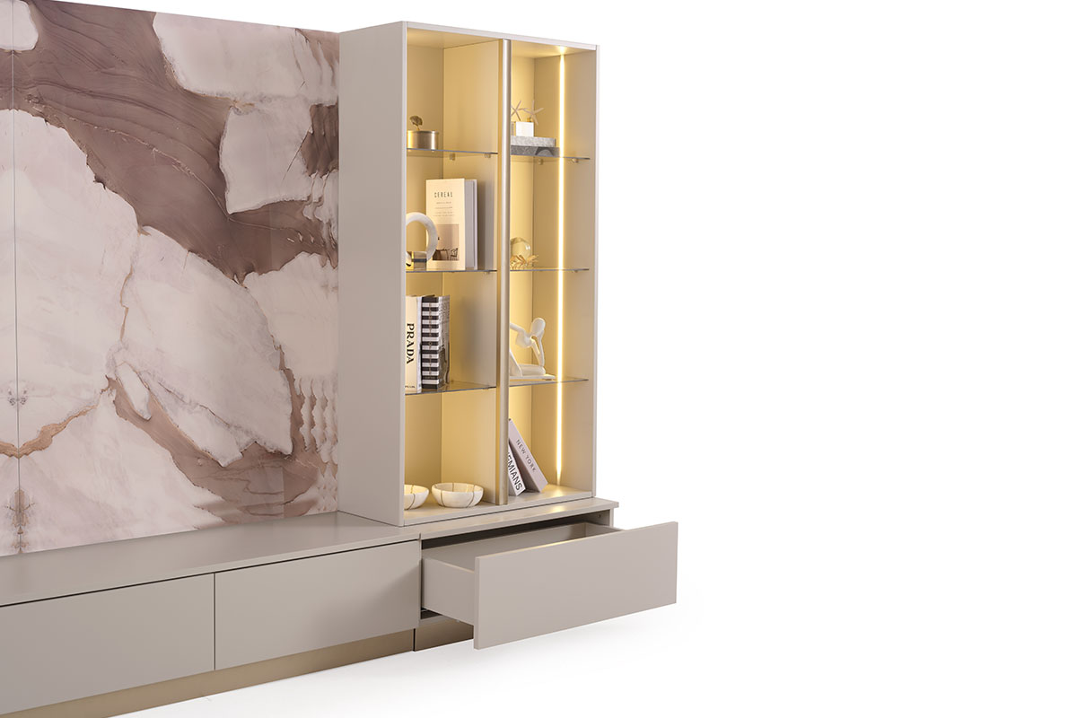 Kaldea, yalın formlar ve yumuşak geçişlerle şekillenen zamansız bir tasarım dilini temsil eder. Dengeli oranları ve mimari duruşu sayesinde mekânda sakin, sofistike ve güçlü bir etki yaratır. Doğal ahşap dokuların, porselen yüzeylerin ve mat lake detayların bir araya gelişi; koleksiyona sıcaklık ve rafine bir derinlik kazandırır. Yumuşatılmış köşeler ve akıcı hatlar,metalik detaylar modern yaşam alanları için hem estetik hem de davetkâr bir bütünlük sunar. Kaldea, gösterişten uzak ama karakterli bir duruş arayanlar için tasarlanmış; birbiri ile uyumlu materyalleri ile zenginleşen çağdaş bir yaşam ifadesidir.